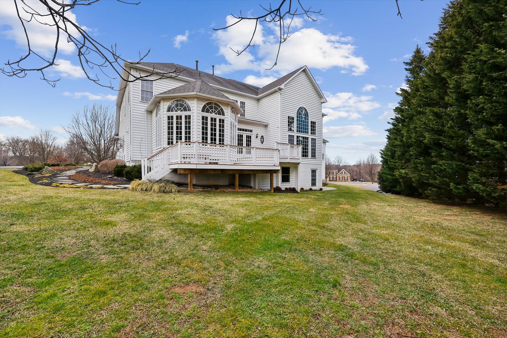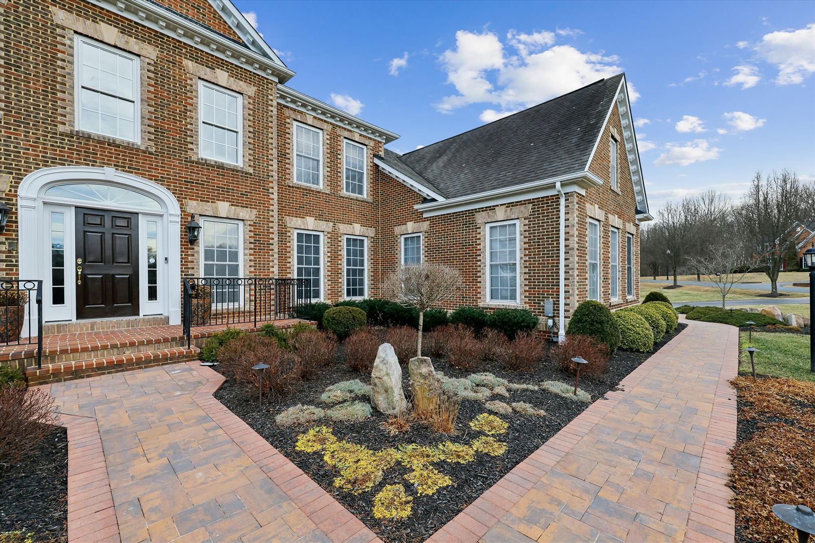 With 5 bedrooms and 5 full bathrooms, this home includes 4 upper-level bedrooms each with private en suite baths, plus a 5th bedroom and full bath on the finished lower level—perfect for guests or extended living. The striking brick exterior is complemented by extensive hardscape, structured plantings, and natural stone elements that create a grand first impression.