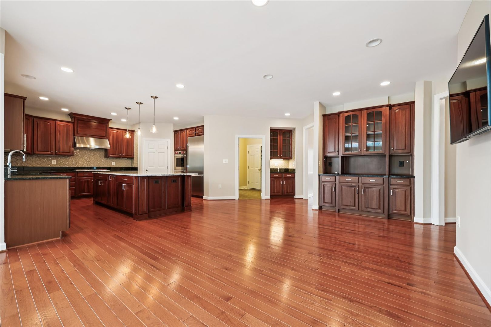 MAIN LEVEL: Enter into a dramatic double staircase foyer with hardwood floors and soaring ceilings. Expansive living spaces include a formal Living Room, sun-drenched Sunroom with tray ceiling, private Library, and a stunning 2-story Family Room with a wall of windows and fireplace. The remodeled chef’s Kitchen features Thermador and Wolf appliances, double granite countertops, a center island with seating, walk-in pantry, and a cabinet with lift-up appliance storage. A sunny Breakfast Room opens to a vaulted Florida Room and a two-tier deck overlooking the private backyard. Additional highlights include a coffee bar, butler’s pantry, rear staircase, Powder Room, and a large Laundry/Mud Room with cabinetry and utility sink.